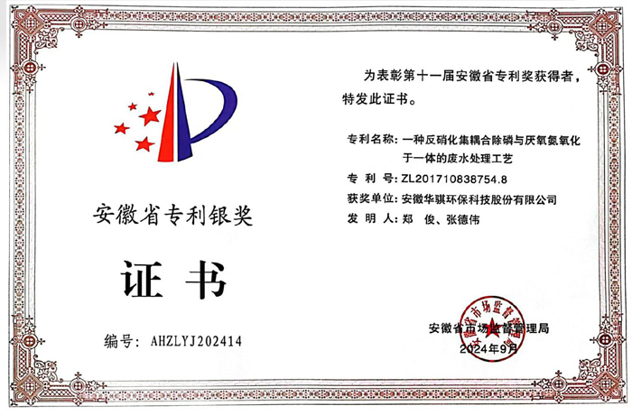 9月3日,安徽省市場監(jiān)督管理局(安徽省知識產(chǎn)權(quán)局)公示了第十一屆安徽省專利獎評選結(jié)果。華騏環(huán)?!耙环N反硝化集耦合除磷與厭氧氨氧化于一體的廢水處理工藝”發(fā)明專利榮獲安徽省專利銀獎。