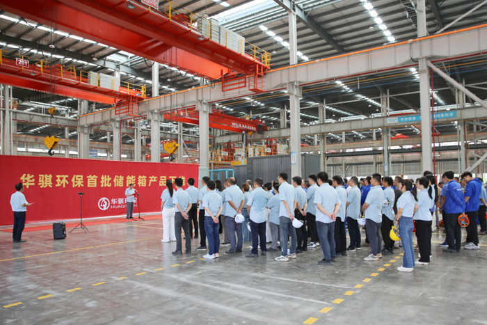 7月2日上午,“華騏環(huán)保首批儲(chǔ)能箱產(chǎn)品下線儀式”在安徽華騏環(huán)??萍脊煞萦邢薰酒煜氯Y子公司安徽華騏蔚藍(lán)智能裝備有限公司順利舉行。馬鞍山經(jīng)開區(qū)黨工委副書記劉凌、華騏環(huán)保董事長(zhǎng)王健、總裁鄭杰、蔚藍(lán)智能裝備總經(jīng)理程曉虎等領(lǐng)導(dǎo)見證下線儀式。華騏環(huán)保董事長(zhǎng)王健、蔚藍(lán)智能裝備常務(wù)副總經(jīng)理張中群分別致辭。劉凌、王健、鄭杰、程曉虎、張中群為第一臺(tái)駛下生產(chǎn)線的儲(chǔ)能箱產(chǎn)品揭幕。