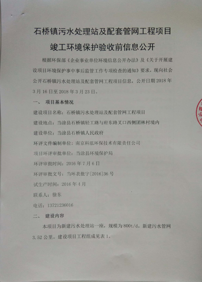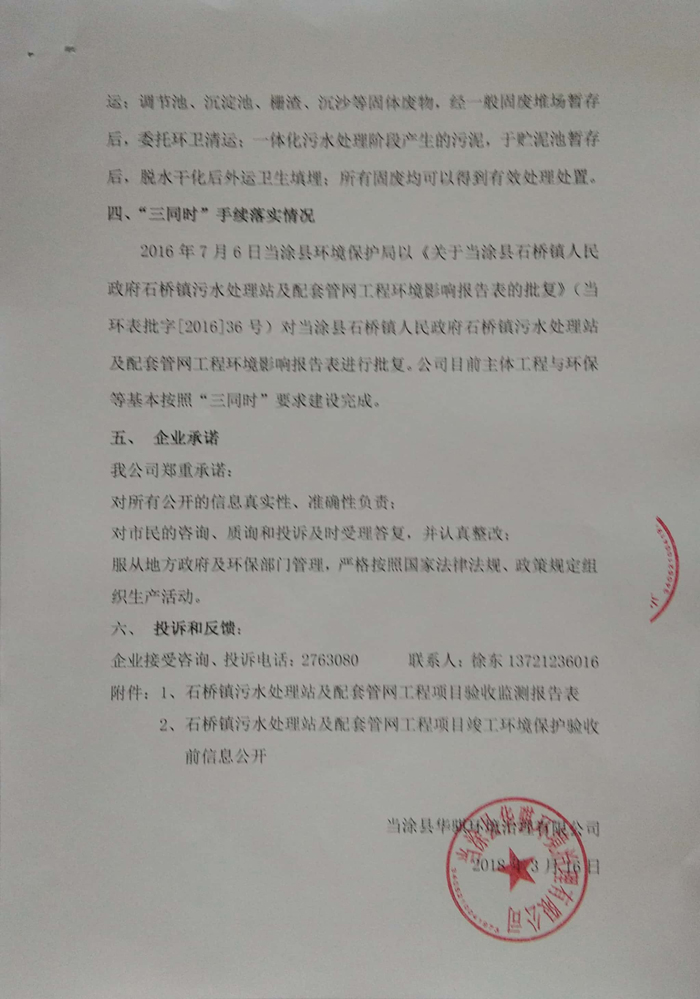 2016年7月6日當涂縣環(huán)境保護局以《關于當涂縣石橋鎮(zhèn)人民政府石橋鎮(zhèn)污水處理站及配套管網工程環(huán)境影響報告表的批復》(當環(huán)表批字[2016]36號)對當涂縣石橋鎮(zhèn)人民政府石橋鎮(zhèn)污水處理站及配套管網工程環(huán)境影響報告表進行批復。公司目前主體工程與環(huán)保等基本按照“三同時”要求建設完成。