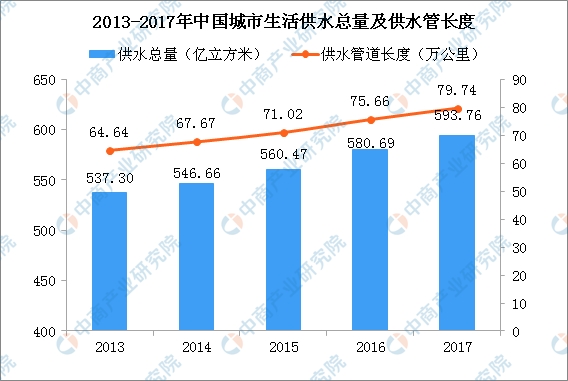 城鎮(zhèn)化水平提升,城市基礎設施建設必然要適應城市發(fā)展,將推動與人們日常生活息息相關的城市公共供水設施及其重要環(huán)節(jié)二次供水設施的建設。2013年至2017年,我國城鎮(zhèn)化率由53.73%提升至58.52%,相應地每年生活供水總量由537.30億立方米增長至593.76億立方米,供水管道長度由64.64萬公里增加至79.74萬公里。如果不考慮城鎮(zhèn)供水普及率提升的影響,平均城鎮(zhèn)化率每提升1個百分點,供水管道長度需要增加2.71萬公里。
