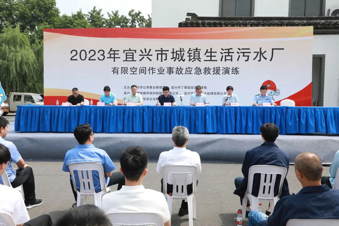 6月,小荷初露,茉莉飄香,宜興市華騏污水處理有限公司在“畢業(yè)季”里交出了一份令人滿意的答卷,宜興華騏從江蘇省76座縣級(jí)以上城鎮(zhèn)污水廠中脫穎而出,在江蘇省住房和城鄉(xiāng)建設(shè)部2021年度城鎮(zhèn)污水處理廠運(yùn)行管理工作考核中獲評(píng)優(yōu)秀。而今年6月亦是第22個(gè)全國(guó)“安全生產(chǎn)月”,為進(jìn)一步鞏固污水板塊安全生產(chǎn)形勢(shì),加強(qiáng)污水處理行業(yè)有限空間作業(yè)管理,提高有限空間作業(yè)事故應(yīng)急救援能力,6月20日,由宜興市公用事業(yè)管理局、宜興市丁蜀鎮(zhèn)應(yīng)急管理局主辦,安徽華騏環(huán)??萍脊煞萦邢薰境修k的“2023年宜興市城鎮(zhèn)生活污水廠有限空間作業(yè)事故應(yīng)急救援演練”在宜興市華騏污水處理有限公司開展,宜興市公用事業(yè)管理局黨組書記、局長(zhǎng)毛俊擔(dān)任演練總指揮,華騏環(huán)保副董事長(zhǎng)鄭俊出席并觀摩了此次演練,副總裁程曉玲做主題發(fā)言。宜興華騏污水公司、佳安企業(yè)管理公司參與演練,丁蜀鎮(zhèn)應(yīng)急局、宜興市城市污水廠、宜興北控公司、歐亞華都水務(wù)公司等相關(guān)領(lǐng)導(dǎo)全程觀摩演練活動(dòng)。